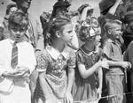 Spectators at the Central Texas Fair at Clifton, Texas, included Jeannette Larson (second from left) and Oletha Paramore (second from right), both of Clifton, Texas. Both girls are wearing dresses and have bows in their hair. Jeannette's dress is polka-dotted and Oletha's dress has lace details on the collar. They, with a crowd of people behind them, are standing behind a rope, watching the parade. There is an unidentified young boy standing at the left beside Jeannette and another boy standing next to Oletha.
