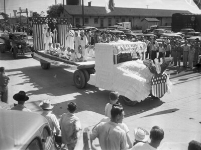Floats (Parades); Parades & processions; Roads; Crowds; Spectators; Central Texas Fair; Fairs; Flags; Uncle Sam; Costumes; Seals (Insignia); Flags--United States