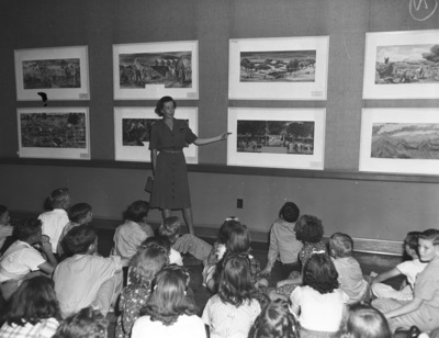 At the Fort Worth Art Association's gallery at the Fort Worth Public Library, Mrs. Horace Wilson, Junior gives an art lesson to a group of children. Mrs. Wilson is pointing at and describing a framed print hanging on a wall in front of the class. The children are all sitting on a linoleum floor.