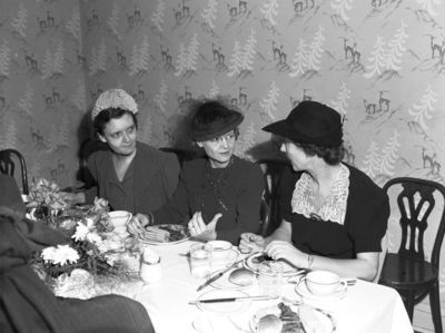 Doctor Nina Fay Calhoun, center, new international president of Altrusa, visiting Miss Elizabeth McDonald, right, president of the Fort Worth, Texas chapter of the organization. Woman at left unidentified. Doctor Calhoun is wearing a dress, hat, necklace and eyeglasses. Miss McDonald is wearing a dress and hat. They are sitting at a table. On the table are plates, cups and utensils.