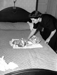Mrs. S. M. Fitts is demonstrating her daily routine with her 11-week old son William "Bill" Samuel Fitts. One of the chores on her agenda is to put Bill down for a late morning nap. He is shown lying in the middle of the bed after his bath. While the baby is napping, Mrs. Fitts, the former Miss K. Dee Sloan, turns her attention to household chores. She is wearing a dark, button-up dress.