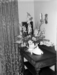 McKnight, Alfred (Mrs.); Garden Club Tea; Garden Club; Flower arrangements; Flowers; Side Tables; Tureens; Gladioli; Delphinium; Daisies; Draperies