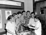 The Stamp Club officers of J. P. Elder Junior High School are shown meeting in a classroom. They are, left to right, Bobby Whisenant, Richard Roach, W. M. Strickland, Wayne Killough, Brackett Smith, Calvin Foster, and Jerry Trimble. Bobby, reporter, is wearing a short-sleeve, button-up shirt. Richard, W. M., and Wayne are auctioneers. All three boys are dressed in Reserve Officers' Training Corps (R. O. T. C.) uniforms. Brackett, secretary, is wearing a striped short-sleeve shirt and trousers. Calvin, vice president, is dressed in a striped button-up shirt and trousers. Jerry, president, is wearing a short-sleeve collared shirt. The Stamp Club meets every Tuesday to discuss, trade, and auction stamps. Miss Anna McGehee has sponsored the club for nine years.