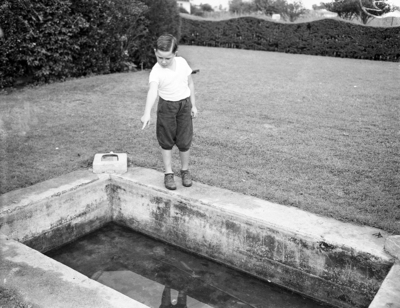 Fish Pond Rescue Scenes. Larry Turnage, 6, son of Mr. and Mrs. Turnage, pointing to fish pond from which he rescued his little sister. Image appeared in "Principals, Scene of Fish Pond Rescue," Star-Telegram Evening Edition October 2, 1941.