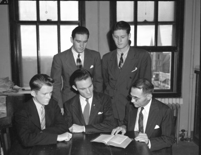 The South Side Church of Christ is holding their Sunday evening young people's "class." Seated left to right are Horace Busby, John Fincher, and D. P. Netterville. Standing behind them are Fred Faulkner, left, and L. G. Lacy. Mr. Netterville is the sponsor of the class. He is explaining a passage in the Book of Philippians to members of the group. The men are dressed in suits. There is a stack of newspapers and a radiator in the background.