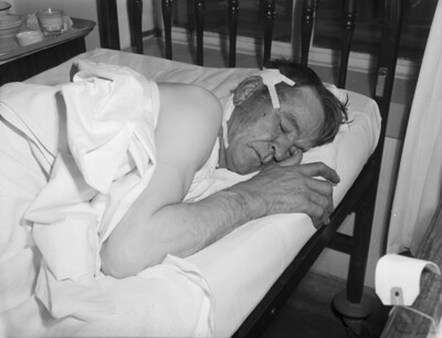 Private Frank Fickel, forty-five, was beaten and left unconscious on the Rockwood Golf Course Tuesday night by two robbers. Private Fickel is a member of the 45th Infantry Division at Camp Barkeley. He is shown recuperating in a hospital bed at City-County Hospital. He sustained head injuries and is suffering from exposure.