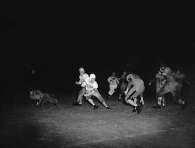 A high school football game between the Polytechnic Parrots and the Arlington Heights Yellow Jackets (white jerseys) is being held at Farrington Field in Fort Worth, Texas. One of the city's best running backs is Yellow Jacket, Wilford Revercomb (33). He is shown driving on a sweep to the right for ten yards. Parrot defender Kenneth Andrews (77) is attempting to make a tackle on the shifty back. Revercomb was injured on the play and the Parrots went on to win the game 36-6. A referee races down through the middle of play.