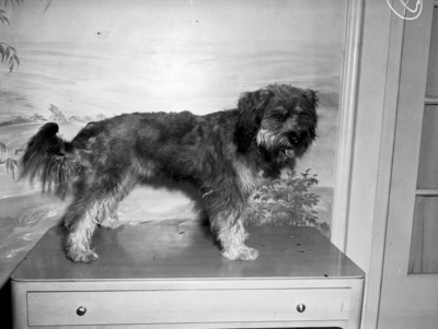 Canine stars from Hollywood are the guests of honor at the Fort Worth Kennel Club's annual dog show. Daisy is attending a luncheon at Hotel Texas with her trainer Earl Johnson. Daisy, who appears in the Dagwood movie series, is reputedly the best canine personality in the United States. She has a real life rags to riches story as she was rescued from the pound to begin her rise to fame. Daisy is standing on a dresser as she poses for the camera. Mr. Johnson, Daisy, and two other movie star dogs will perform tricks at the dog show.