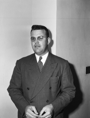 J. T. Whitfield is the new assistant Tarrant County Agent. He is in charge of the 4-H Club boys work. He is standing against a wall, dressed in a double breasted suit.