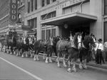 "Texas" movie premiere in Fort Worth, Texas, featuring a coach being drawn by Anheuser-Busch Company's eight-horse hitch of Clydesdale horses from St. Louis, carrying Budweiser beer, in front of the Hollywood Theater.