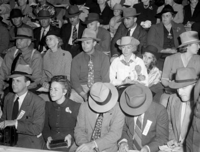 Highland Hereford Association auction crowd. People (men and women) are wearing a combination of suit, ties and hats. None of them are identified.