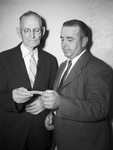 Charles Thomas, left, is shown buying the first ticket to the Riverside Methodist Church "victory banquet" from Hollis Ingraham, chairman of the ticket sales committee. Mr. Thomas and Mr. Ingraham are wearing suits and ties. The men are standing against a wall and holding a ticket between them. Published in the Fort Worth Star-Telegram morning edition, October 12 1941.