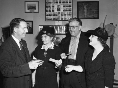 Sheriff A. B. Carter, Mrs. E. H. Pope (Lena Pope Home), George J. Kreyenbuhl (St. Teresa's Home) and Mrs. Joe Kingsbery (All Church Home), conferring (left to right). Image appeared in "Slot Machines Pay Jackpot to Charity," Star-Telegram Evening Edition October 7, 1941. The organizations each received $25 checks together with the Fort Worth Press Santa Pals and the Star-Telegram Goodfellows Fund and Free Milk and Ice Fund. The $150 was derived from the sale of material salvaged from 165 slot machines, marble boards, and other gambling devices confiscated by the sheriff's forced during the last four years and recently ordered by Justice of the Peace Brown to be sold with the proceeds going to the six charitable funds.