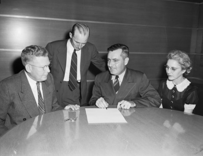 Final step in plans for the blind golfers' world champion ship match at Rockwood golf course October 26 were completed when this picture was taken as Marvin Shannon of Fort Worth, Texas, the challenger, with pen in hand, signing contract to meet Clinton F. Russell, Duluth, Minnesota; titleholder by virtue of defeating Shannon recently at Duluth. Seated at the table are, at left, Councilman Eagle, general chairman for the match, and at right, Mrs. Alice Woodlan, secretary. Standing is Skeet Fincher, Rockwood pro and Shannon's coach. Proceeds from the match will go to the Fort Worth Lighthouse for the Blind. There is a pocket watch on the table. Published in the Fort Worth Star-Telegram evening edition, October 8, 1941.