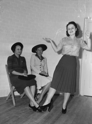 Preparing for the Junior League Jamboree left to right are Mrs. George Kemble, Mrs. Ralph Cummins, and Miss Camilla Beall. Mrs. Kemble is the program chairman. She is sitting on a chair, wearing a hat, blouse, brooch, and a skirt. Mrs. Cummins is the concessions chairman. She is dressed in a hat, blazer, brooch, and a skirt. They are watching Miss Beal, a member of the chorus, demonstrate a dance step. She is wearing a button-up blouse with a pleated skirt. Published in the Fort Worth Star-Telegram October 12, 1941.