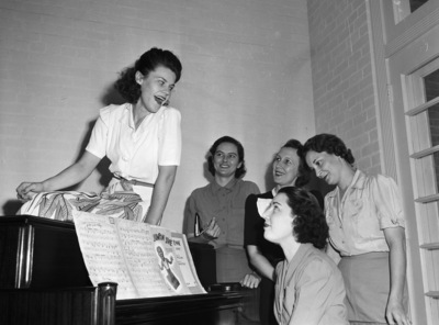 The 1941 production of the Junior League will be presented at the Pioneer Palace, October 16 through 18. A group of women are shown rehearsing their roles. Miss Christine Stone, is sitting on the piano while Mrs. George M. Merrill, plays. Standing left to right are Mrs. Bob Barker Junior, Mrs. W. R. Watt, and Mrs. James C. Wilson Junior, looking on. Miss Stone is wearing a button-up blouse and a skirt with a feather design. Mrs. Merrill is dressed in a button-up blouse. Mrs. Barker is dressed in a collared blouse and a skirt. Mrs. Watt is wearing a dress with a wide collar. Mrs. Wilson is dressed in a button-up blouse and a skirt. Published in the Fort Worth Star-Telegram morning edition, October 12, 1941.