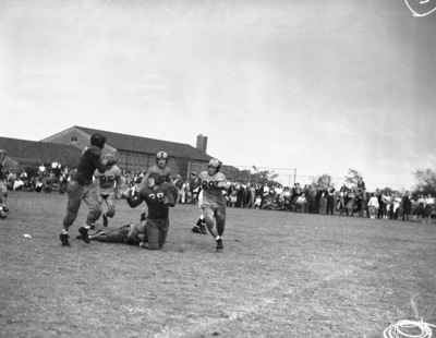 A college football game is being held at Farrington Field in Fort Worth, Texas. The Texas Wesleyan Rams are hosting the visiting Southwestern University Pirates (white jerseys). In the third quarter of the game the Rams finally got on the scoreboard with their first touchdown. Setting up the score was a fifteen yard pass to back Odell Harrison (39). Just as he was being tackled by a Pirate, Odell lateraled the ball to his twin brother Marcell Harrison (38), an end,. Marcell completed the twenty-seven yard gain before Pirate Guy Brantley (88) brought him down. The Rams scored on the next play and went on to win the game 15-6. "(Star-Telegram Photos by Tommy Dillard.)" Published Star-Telegram Morn. Oct. 5, 1941.