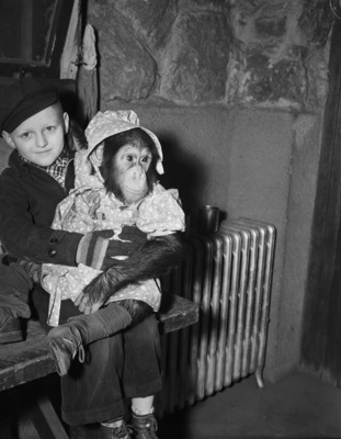 Jerry Hittson holding "Annabella Panzee," a chimp at the Forest Park Zoo. Annabella is going on three years old and has traded in her tomboy clothes for ladylike frills. She is dressed in her new bonnet and frock. Jerry is the son of zookeeper Hamilton Hittson. He is wearing a hat, coat, scarf, and gloves. The pair are sitting on a bench next to a radiator.