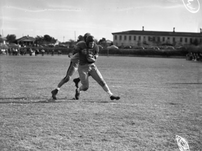 A college football game is being held at Farrington Field in Fort Worth, Texas. The Texas Wesleyan Rams are hosting the visiting Southwestern University Pirates (white jerseys). In the fourth quarter of the game the Rams threw a pass downfield to end Kenneth Moore (45). With a determined expression on his face, Moore carried a Pirate tackler over the goal line with him for a touchdown. the score extended the Ram lead. They went on to win the game 15-6. "(Star-Telegram Photos by Tommy Dillard.)" Published Star-Telegram Morn. Oct. 6, 1941.
