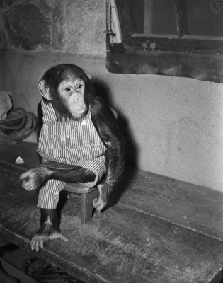 Annabella Panzee received a makeover before spring comes to the Forest Park Zoo. Posed in the "before" photograph, Annabella is turning in the overalls she's been wearing for ladylike frills. Come springtime, she'll be the Zoo's best dressed lady.