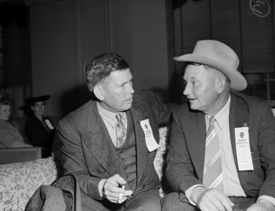36th Division Veterans Association annual reunion was held at Hotel Texas, Fort Worth, Texas. Two attendees are shown here. They are, from left to right, Earnest Carroll of Waxahachie, Texas and B. W. Woodard of Whitman, Texas. Two men are sitting on a couch. Both are wearing suits and ties and an identifying 'Reunion badge'.. Mr. Woodward is wearing a cowboy hat and starting a story to Mr. Carroll who is smoking a cigarette. Published in the Fort Worth Star-Telegram morning edition, October 5, 1941.