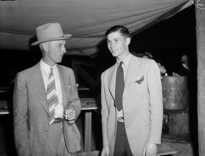 The Highland Hereford Breeders Association sold their 1941 crop of feeder calves at Marfa. The sale attracted visitors from many States. The auction attracted the attention of the Chuck Wagon Gossiper. Shown two attendees, from left to right, are C. E. Goodfellow and his son John Goodfellow, both of Springfield, Ohio. Mr. C. E. Goodfellow is wearing a suit, stripped pattern tie, and a cowboy hat. He is smoking a cigarette. Mr. John Goodfellow is wearing a suit and dark tie. The Goodfellows have fed Highland cattle for several years and attended the sale this year to see the country and meet the men who produce Highland Herefords. Published in the Fort Worth Star-Telegram morning edition, October 9, 1941.