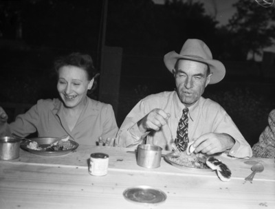 Some attendees who took part in the recent sale of feeder cattle by the Highland Hereford Breeders Association at Marfa, two of them are pictured here. They are Mr. and Mrs. Joe Bunton, who ranch near Marfa, Texas. They are shown seated at outside table and enjoying the barbecue and other fixin's.. Published in the Fort Worth Star-Telegram morning edition, October 8, 1941.