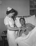 The nurses at Camp Wolters in Mineral Wells, Texas, are staying busy as they make their rounds. Gladys Nash of Harlingen, Texas is taking the pulse of Private Loren Chard. Miss Nash is dressed in her nurses hat and uniform. Private Chard is laying in a hospital bed, wearing a button-up shirt. Published in Fort Worth Star-Telegram, morning edition, October 7, 1941.