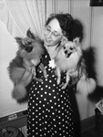 Mrs. L. W. Chelmo and her two Pomeranian dogs "Little Colonel" (left) and "Laddie Boy" are pictured here. Mrs. Chelmo is wearing a polka dot dress and eyeglasses. She is shown standing and holding the dogs. Little Colonel disappeared during the Kennel Club show and Laddie Boy was missing from its cage. Both dogs were found and captured. They are home with their owner Mrs. Chelmo. Published in the Fort Worth Star-Telegram morning edition, October 7, 1941.