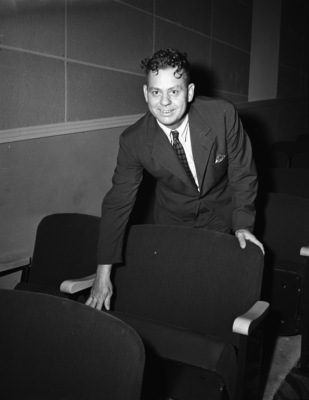 Claude Kennell, manager of The Gateway, Fort Worth's newest suburban theater. He is shown standing near a love seat, wearing suit and tie. Mr. Kennell is showing off one of the spacious "love seats" for the new theater house. These are one third wider than the regular seats and afford plenty of "stretching" room. The new house, located at 4101 East Lancaster Avenue, will open Thursday night. Published in the Fort Worth Star-Telegram evening edition, October 8, 1941.