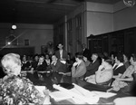 The Board of Education Wednesday night heard from patrons protesting the proposed closing of a group of elementary schools. Fort Worth school hearing participants shown here is, Jim Gaddy Norris, spokesman for the B. H. Carroll patrons, standing, presents the argument of his district. Around the table, left to right, are Ed P. Williams, school business manager; three board members Rosco Minton, Floyd Maben and H. H. Morse. Between Maben and Morse in the background is Bruce Shulkey, assistant superintendent of schools. Standing in the background is Reverend (Rev.) R. E. Bass, spokesman for the Worth Heights patrons. All male are dressed professionally. Published in the Fort Worth Star-Telegram evening edition, October 9, 1941.