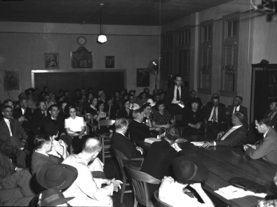 Wednesday night patrons of seven elementary schools protested to the Board of Education over the suggested closing of their buildings. A section of the Board of Education's assembly room is pictured here. D. P. Massey is standing and speaking to the room full of people in regard to the retention of S. S. Dillow School. He is dressed professionally with suit and tie. Published in the Fort Worth Star-Telegram morning edition, October 9, 1941.
