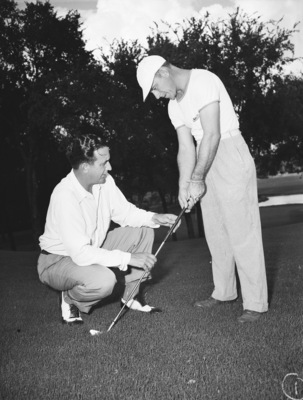 Dick Grout, Colonial golf pro who transferred recently from Wichita Falls Colonial Club (C. C.), is a busy man these days. Here's Grout giving a lesson to Clyde S. McCall. Published in the Fort Worth Star-Telegram morning edition, October 9, 1941.