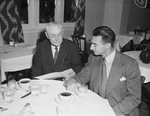 The annual Fort Worth Medical and Surgical Clinics were held at Hotel Texas Wednesday. Two attendees are pictured here. They are, from left to right, veteran Dr. John Burleson, San Antonio, Texas, past president, and young Dr. Myron Herman. Two men are wearing suits and ties and Dr. Burleson has eyeglasses on. They are shown seated at a breakfast table. Dr. Burleson helps Dr. Herman select a well-balanced breakfast. Black coffee started these doctors off for a full day's program at Hotel Texas, Fort Worth, Texas. Published in the Fort Worth Star-Telegram evening edition, October 8, 1941.
