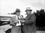 The first annual Trinity Valley Exposition in Liberty will be held on October 22-26. Trinity River boosters making a resources tour Wednesday at Huntsville. Shown here are F. T. Ball, Left, of Huntsville, chairman of the tour, and Harvey L. McGuire of Liberty. Both men are wearing suits and ties and hats. They are standing by the Trinity Valley Resources Tour bus and examining a quartzite sandstone from a Huntsville quarry, where the party stopped for an inspection. Published in the Fort Worth Star-Telegram morning edition, October 9, 1941.
