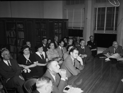 The Board of Education Wednesday night heard from patrons protesting the proposed closing of a group of elementary schools. Fort Worth school hearing participants shown here are, seated front row, three board members Rosco Minton, Floyd Maben and H. H. Morse (partially hidden by Maben), and Superintendent Green. Seated second row, Miss Lovie Carter, Paschal teacher; Mrs. Alice Hale, Polytechnic High registrar; Mrs. Jessie Ericson, nurse; G. L. Ausmus, Polytechnic teacher; Miss Bess Simpson, D. McRae teacher, and E. R. Barton, Sam Rosen principal. Seated back row, R. O. Fincher, E. M. Daggett principal; Weldon Bradley, Mrs. Bradley, a teacher; Roy Darrow, custodian, and Miss Gladys Simons, president of the classroom teachers. All male and female are dressed professionally. Published in the Fort Worth Star-Telegram evening edition, October 9, 1941.