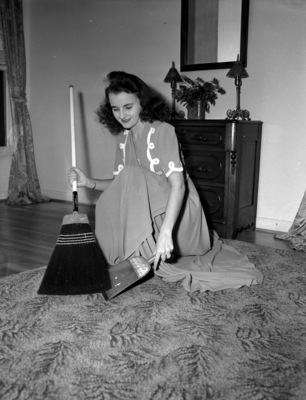 When a bride comes home from a honeymoon and settles down to the household, there are many tricks to learn, as Mrs. Robert David Hawley has found out. She is the former Miss Love Jacobs. Shown here in their apartment at 3560 West Fourth Street, Fort Worth, Texas, kneeling on a rug and using a broom and dustpan. Behind her stands a dresser with two lamps and a flowerpot sitting on it and a mirror hanging above it. Published in the Fort Worth Star-Telegram morning edition, October 12 1941.