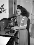 When a bride comes home from a honeymoon and settles down to the household, there are many tricks to learn, as Mrs. Robert David Hawley has found out. She is the former Miss Love Jacobs. Shown here in their apartment at 3560 West Fourth Street, Fort Worth, making coffee for breakfast. Mrs. Hawley is standing in front of a kitchen counter and pouring coffee grounds into a glass coffeemaker that is sitting on the counter. A toaster, glass dish, and other items are also on the counter. Mrs. Hawley is wearing a long dress with decorative accents in the body and sleeves, and tied at the waist. Published in the Fort Worth Star-Telegram morning edition, October 12 1941.