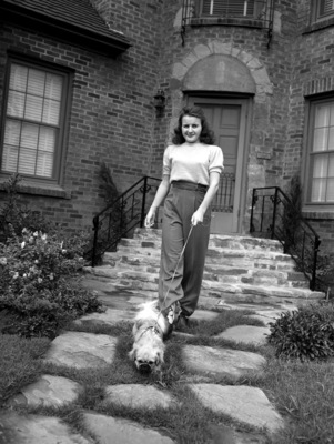 When a bride comes home from a honeymoon and settles down to the household, there are many tricks to learn, as Mrs. Robert David Hawley has found out. She is the former Miss Love Jacobs. When her household is in order she dons slacks for leisure hours and takes her dog for a walk. Mrs. Hawley is walking on a rock pathway outside of her house, holding the leash of the dog. The front door and front steps of the house are visible. Published in the Fort Worth Star-Telegram morning edition, October 12 1941.