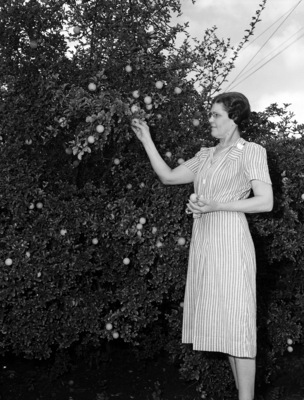 Mrs. M. Frank Kinney is shown wearing a striped dress and glasses and picking fruit from the ornamental orange tree in the yard of her home. The tree, 12 years old, has bloomed three times this year but the fruit in inedible. Published in the Fort Worth Star-Telegram.