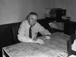 Thomas Fletcher, superintendent of Masonic Home and School, shown sitting at his desk, studying a large map of Texas that covers the entire desk. The map was produced by the National Map Company. Mr. Fletcher is wearing a long-sleeve, button-up shirt and a necktie. Beside his desk at the right, is a bookshelf filled with various books and papers.