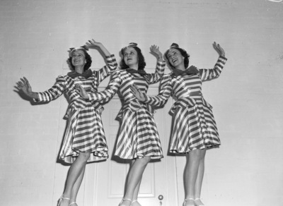 The Junior League is performing a preview of the Jamboree of 1941 during dress rehearsals. The Jitter-bugs are left to right Mrs. Jack Furman, Miss Camilla Beall and Miss Elizabeth Ryan. The women are standing, posed with extended arms, left arm is head- height. They wearing matching costumes that consist of hats and horizontal stripped dresses with a bow at the collar. The Jamboree will be held in the Pioneer Palace from October 16 through 18. Published in the Fort Worth Star-Telegram evening edition, October 16, 1941.