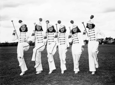 Polytechnic High school band majorettes include (left to right) Betty Turner, Mae Ellen Arterbury, Jackie Clardy, Bettie Armstrong, Earleene Miller and Mary McMurray. Six girls are wearing band uniforms and posed twirling batons. They will be seen at Farrington Field Saturday night at the Poly-Technical High School football game. The majorettes will march with the 72-piece band. Published in the Fort Worth Star-Telegram morning edition, October 18, 1941.