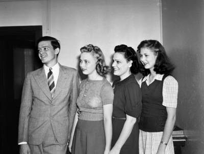 New officers of the Sunday Evening Club, Saint John's Evangelical Church are pictured here. They are, left to right, Leroy Steinmann, parliamentarian, Miss Wilma Petzold, vice president; Myrtle Lee Anglin, president, and Catherine Runge, secretary-treasurer. The four of them are standing in a corner of a room with a doorway beside them. All are dressed well and smiling. Published in the Fort Worth Star-Telegram evening edition, October 11 1941.