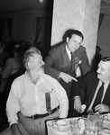 Commander B. M. Hatfield (left) and C. L. Douglas sit at a dining table, as Bill Daniel laughs and points at Mr. Douglas. Both Commander Hatfield and Mr. Daniel are wearing "Trinity Valley Tour" ribbons. There is a tea cup, spoon, and saucer on the table directly in front of both Commander Hatfield and Mr. Douglas. Between them rests on the table a glass pitcher of water, a glass full of water, and a few dirty plates. Mr. Douglas holds a napkin.