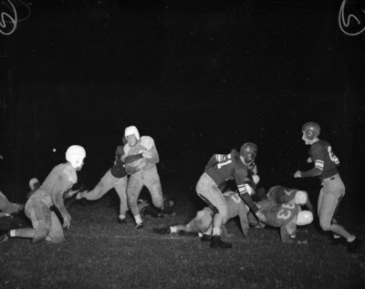 A football game between the Masonic Home High School and North Side High School is being held at Farrington Field in Fort Worth, Texas. Mason fullback Gordy Brown is shown with the ball early in the second quarter. He cut back over the left tackle from the five-yard-line and pushed the ball into the end zone. The touchdown went for the first score of game. Bobby Putnam (51) is the North Side player nearest to the camera. An unidentified Steer is attempting to wrap-up Brown. At least 11 young men are in the photo frame, all wearing football uniforms, football boots, and stitched leather helmets. (Star-Telegram Photos by Tom Dillard) Published Star-Telegram Morn. Oct 12, 1941