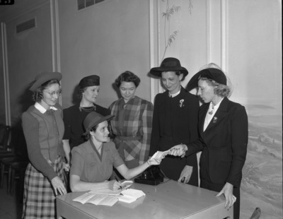 The Fourth Annual Goodfellow Ball will be held on November 29 at the Hotel Texas. The event is being sponsored by the Business and Professional Women's Club. Distributing tickets to team captains is ticket chairman Mrs. Marie Newson Bills (seated). Standing, left to right, are Miss Frances Wand, Miss Bonita Wright, Mrs. Audie Largent, Mrs. Lillian Fowler and Mrs. Mary Elizabeth Murphy. One-hundred percent of the ticket sales will go to the Goodfellows Fund. Mrs. Bills is wearing a brimmed hat and a collared blouse. Miss Wand is wearing a hat, eyeglasses, sweater and a plaid print skirt. Miss Wright is wearing a dark dress and a hat. Mrs. Largent is wearing a dress, brooch and a checkered blazer. Mrs. Fowler is wearing a dark dress, blazer and a hat. Mrs. Murphy is wearing a blouse, blazer, skirt and a veiled hat.