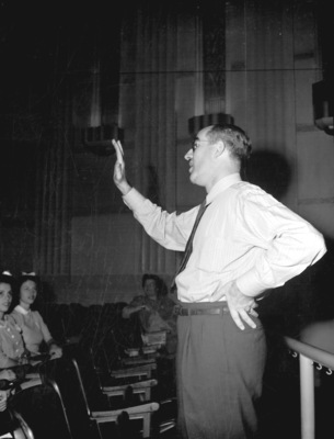 Local high school students are participating in a Vocal Clinic at the North Side High School auditorium. The vocal clinic is sponsored by the State Department of Education with Professor Archie N. Jones, University of Texas, conducting. Professor Jones is shown standing at the front of the auditorium. He is wearing a dress shirt, necktie, and trousers.