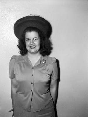 Miss Elinore Niolon of San Bernardino, California has been visiting her aunts, Miss Carrie Van Blarcom and Mrs. Langford Carlton, in Fort Worth en route to her home from Mobile, Alabama and New Orleans, Louisiana. She is shown wearing a dress with a turtle-shaped brooch on her lapel and a large hat. She is standing against a wall and smiling to the camera. Published in the Fort Worth Star-Telegram morning edition, October 12 1941.