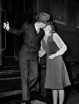Off to complete education. Howard Batis, whose sister, Miss Virginia Batis, kisses him goodbye as he boards the train, left Friday afternoon for Morristown, New Jersey, where he and a seeing eye dog will be trained together for a month. Batis has been blind since he was 13. Published Fort Worth Star-Telegram Morning Edition October 11, 1941.